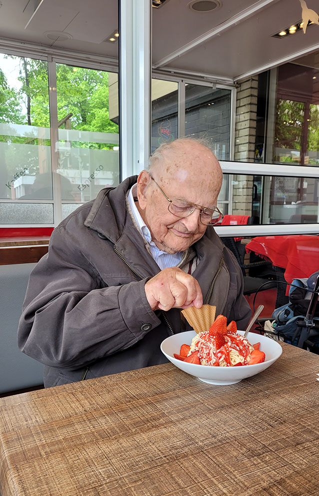 Im Anschluss gab es noch ein Spaghettieis mit frischen Erdbeeren im Stamm-Eiscafé. Keiner hätte geglaubt, dass ein einziger Mensch so viel Eis essen würde, doch Herr H. löffelte die riesige Portion bis auf den letzten Rest auf und sagte danach mit einem breiten Grinsen im Gesicht: „Na, ich denke, dass die Erdbeeren alle sind, ansonsten würd‘ ich mir direkt noch eins bestellen.“