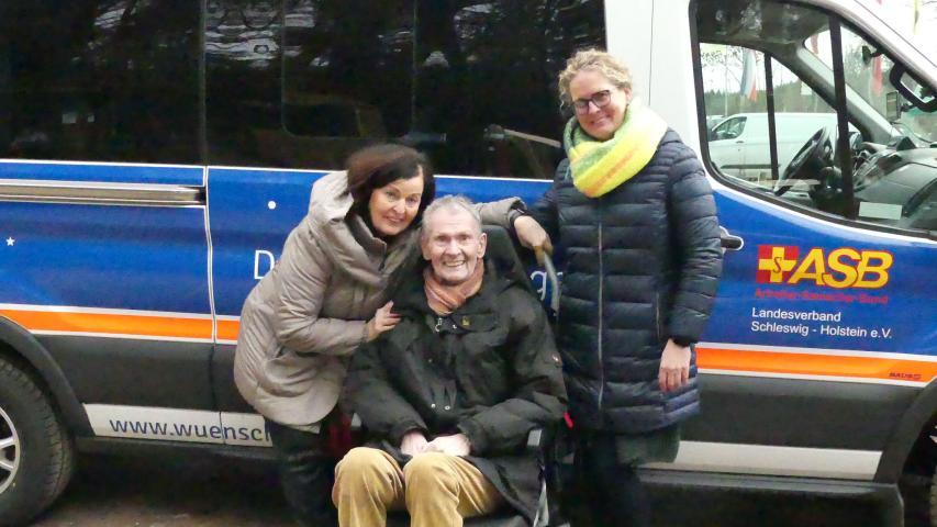 Eigentlich sollten wir Herrn S. beim Verlassen des Hauses behilflich sein, da er auf Grund seiner schweren Erkrankung ein wenig Unterstützung beim Treppensteigen benötigt - aber die Vorfreude auf die Fahrt hat dem 77-Jährigen die Energie verliehen, die Stufen in seinem Haus selbst zu überwinden. Was für ein toller Start für seine Wunschfahrt.