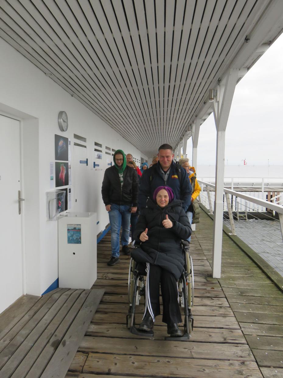 Wir machten uns fertig für die Fahrt, Ivonnes Sohn begleitete sie im Wünschewagen, ihre Freunde fuhren uns hinterher. An der Seebadeanstalt, die eigentlich bereits in der Winterpause ist, wartete Sven mit Neoprenanzügen auf uns. Wir entschieden, dass ich mit Ivonne ins Wasser gehe. Sven hatte auch einen Schwimmgürtel und eine Rettungsboje mitgebracht, beides kam zum Einsatz. Die Worte von Ivonne im Wasser: „Geil, geil, geil….“ Sie erzählte, dass sie ganz oft bei Wind und Wetter schwimmen gegangen ist.